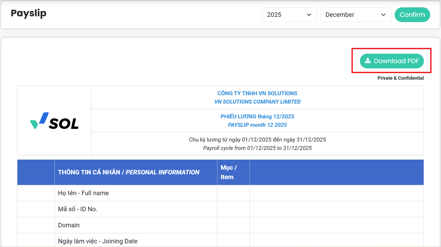 - Click "Download PDF" to download the payslip, and use your 12-digit ID card as the password to open the file.