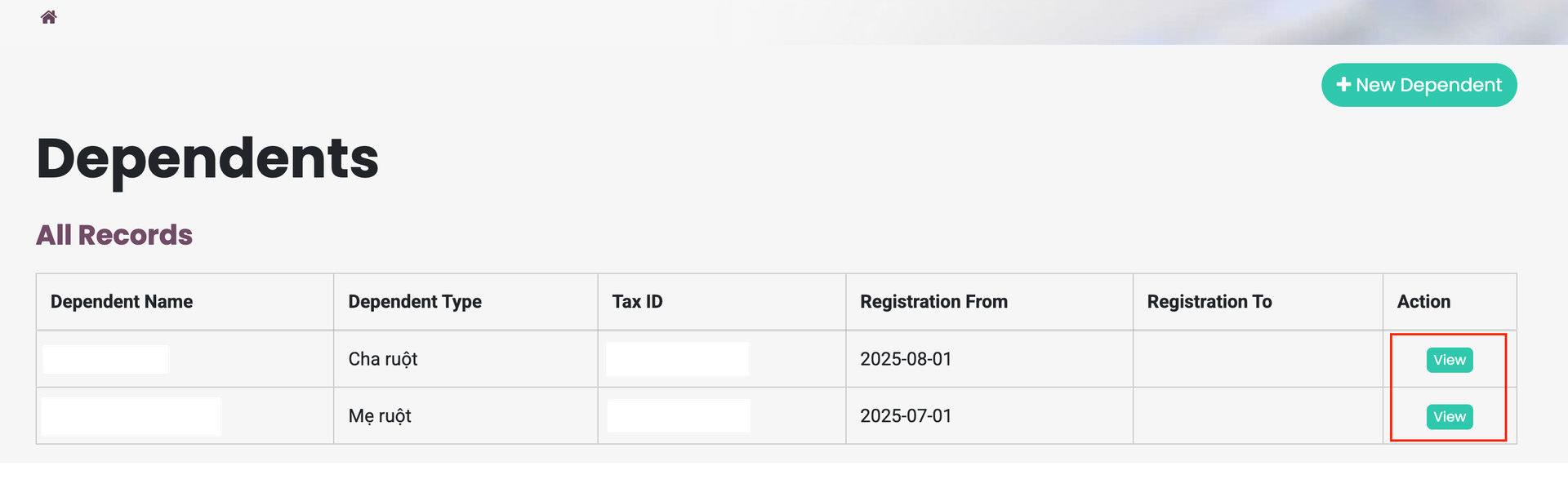 View results Xem kết quả | A list of dependents will be displayed. Click on each dependent to view detailed information, including: