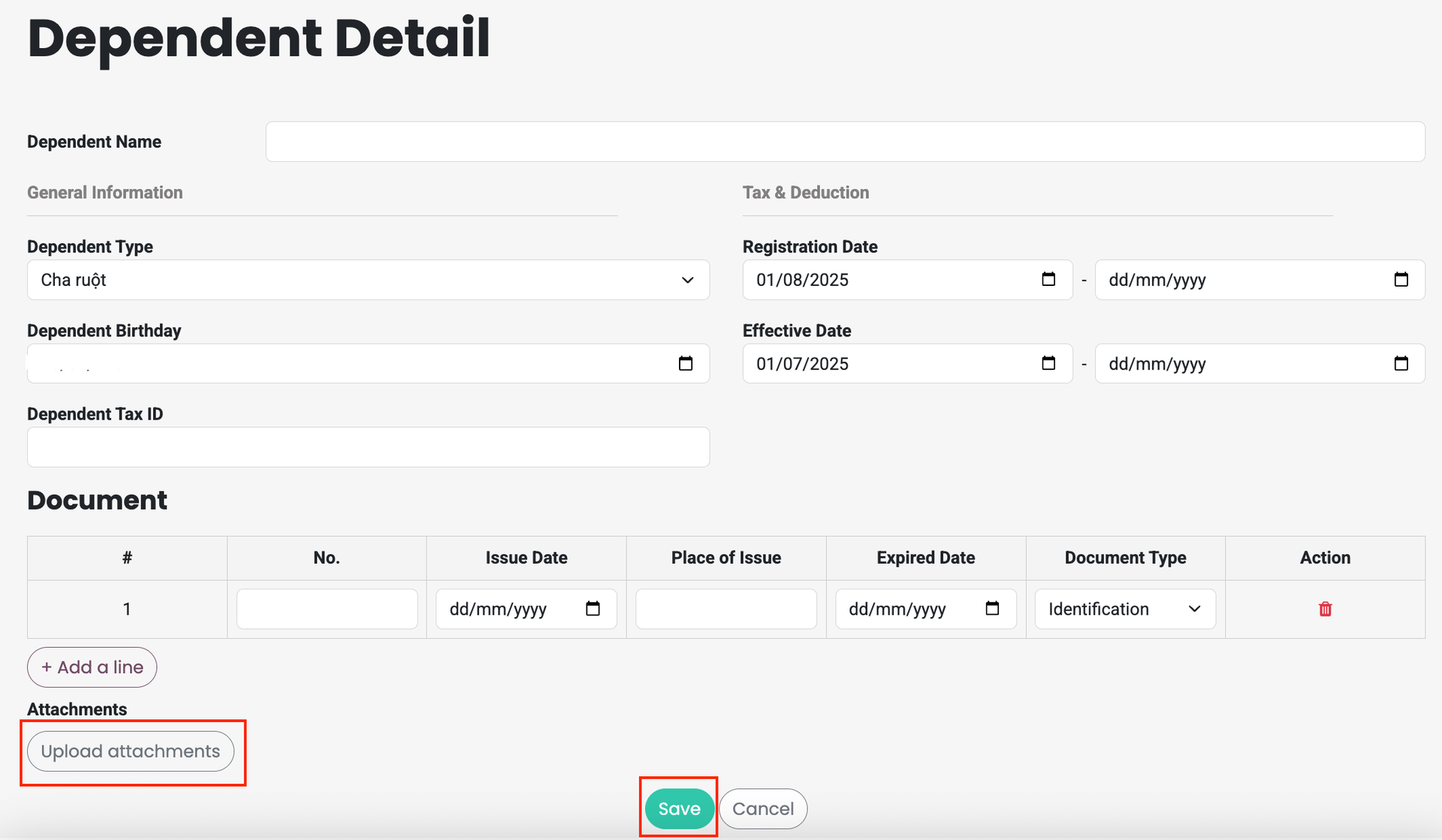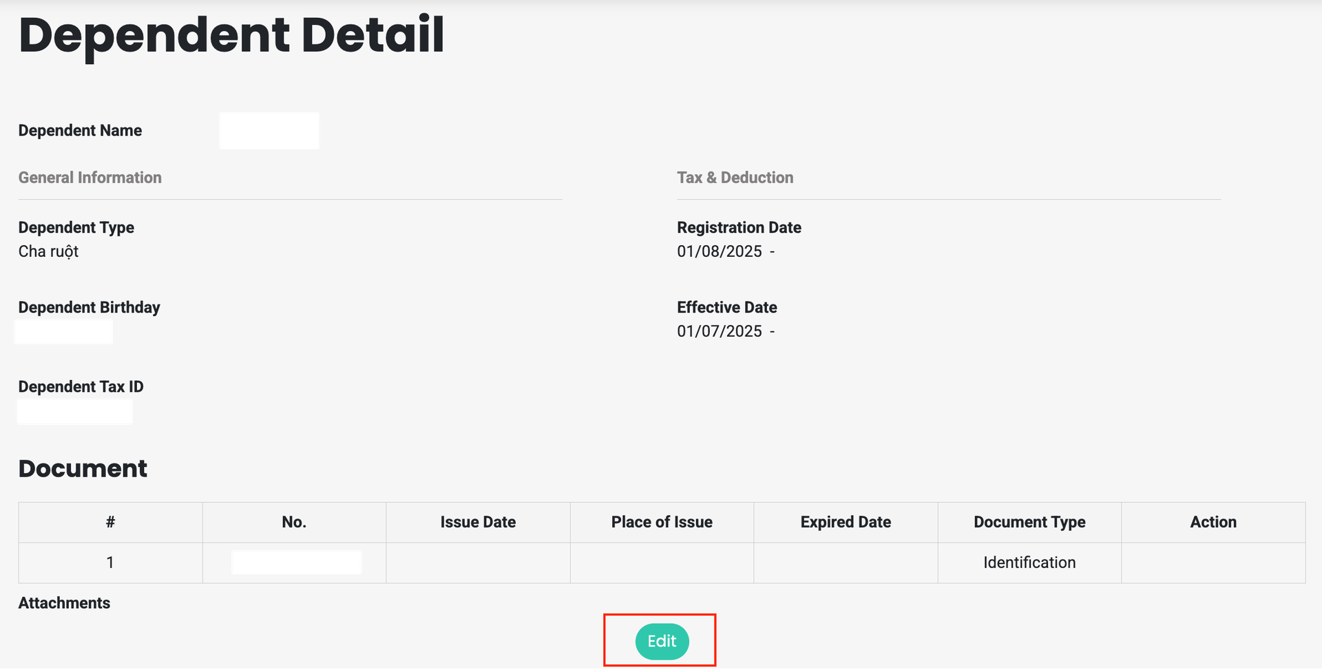 - Màn hình thể hiện thông tin cơ bản về NPT: họ tên, quan hệ với nhân viên, tax ID.